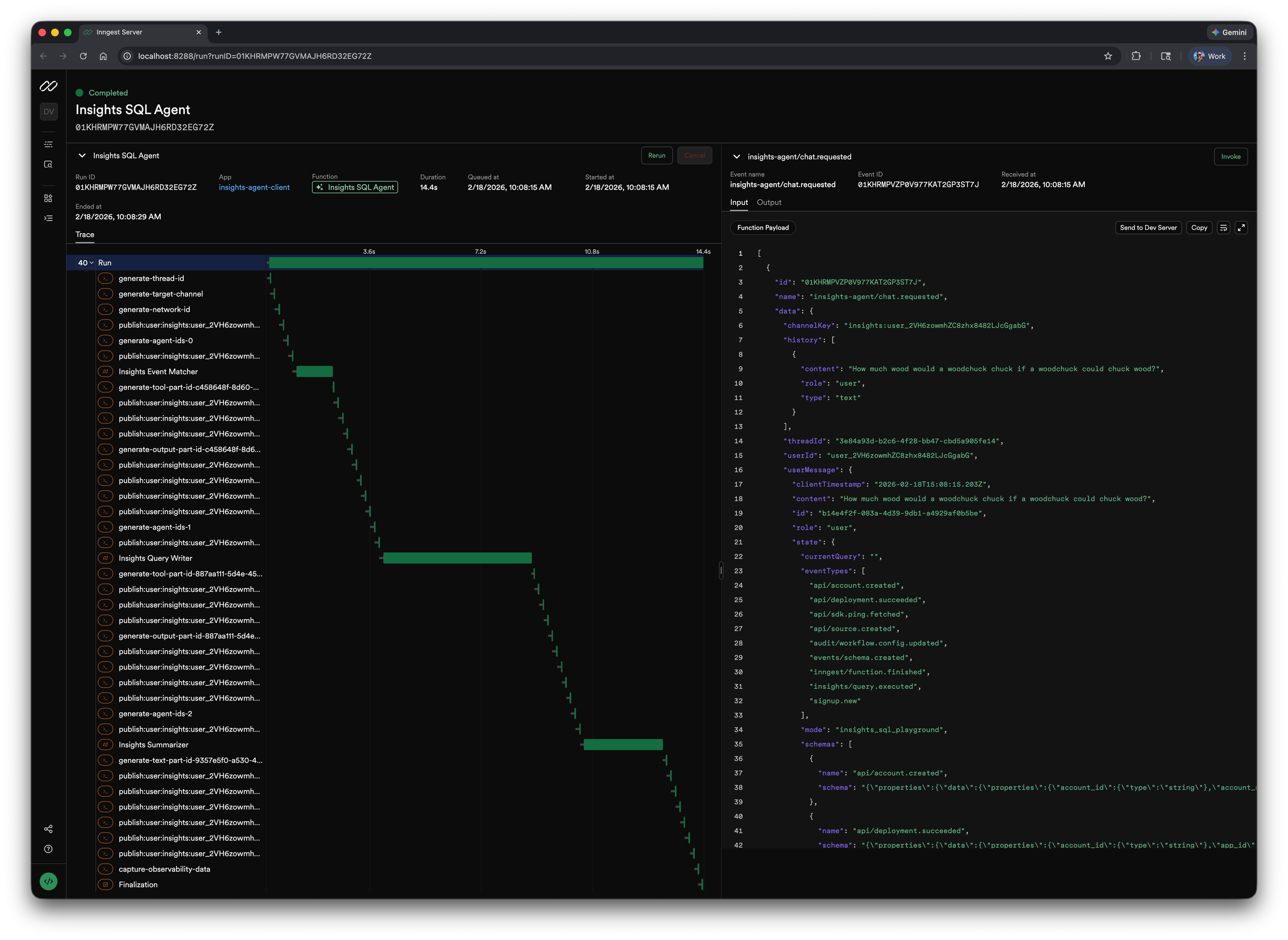 The code for Insights AI is in our open source repo: github.com/inngest/inngest. You can see the agent implementation, the prompts, and how we wired it all together.