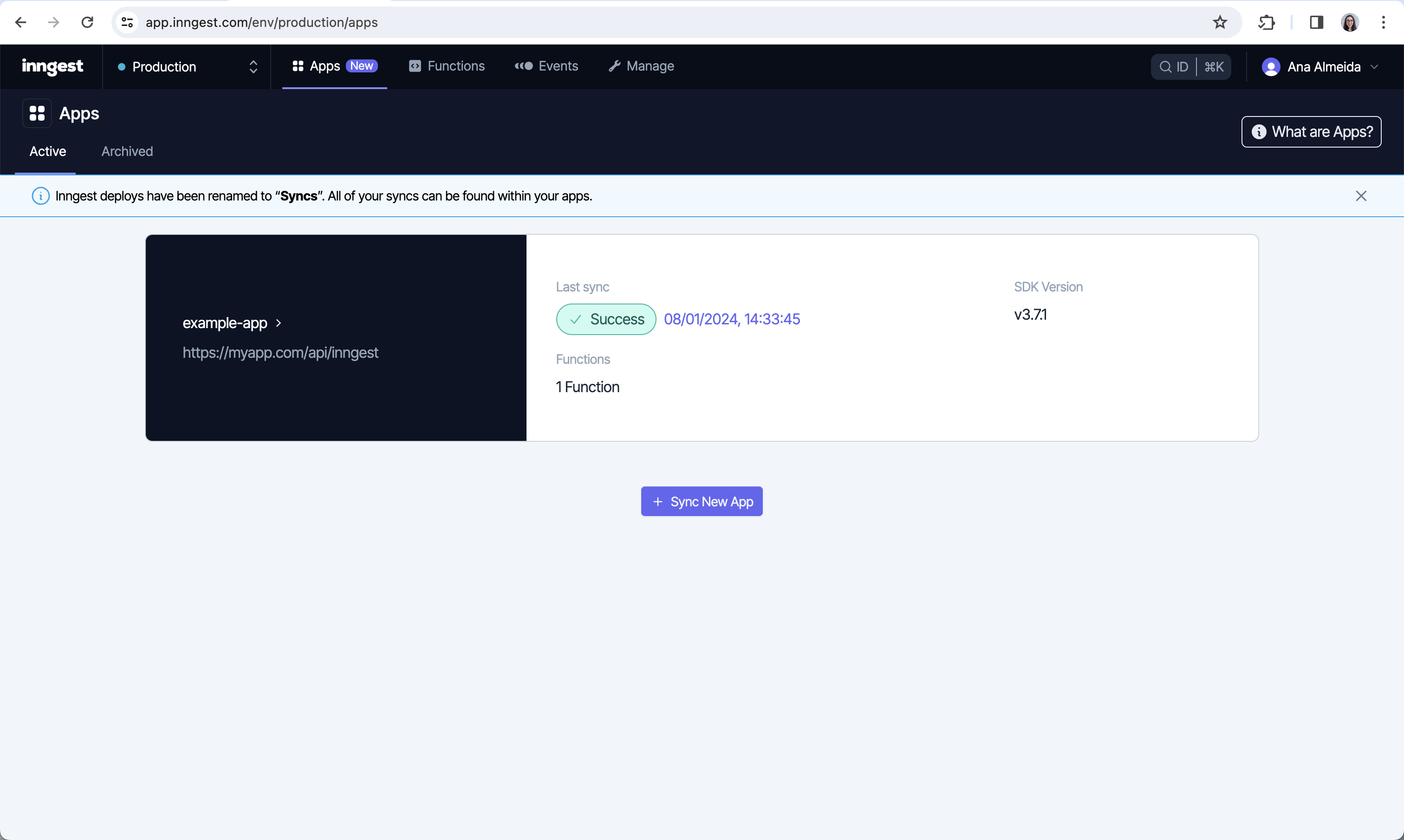 In the image below, you can see the apps page in Inngest Cloud. Check the Working with Apps Guide for more information about how to sync apps in Inngest Cloud.
